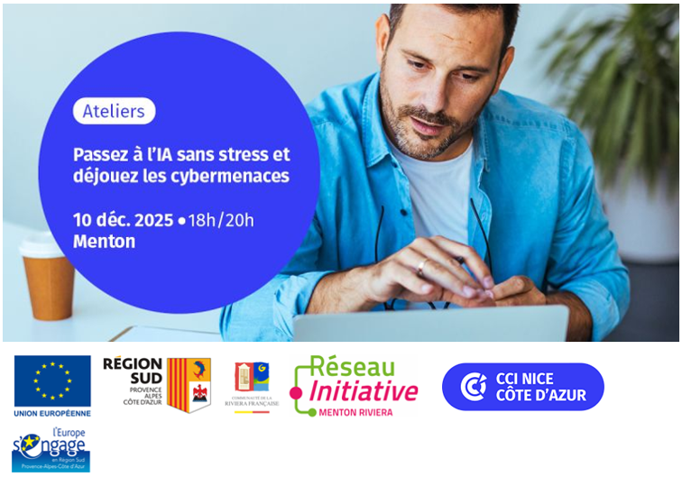 Les ateliers "IA & Cybersécurité qui auront lieu le 10 décembre prochain à 📍Menton à partir de 17h30 pensés spécialement pour les TPE sont faits pour vous !
